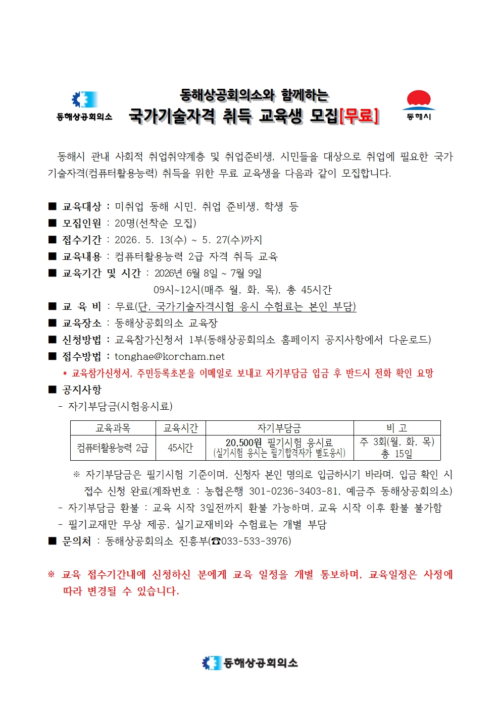 대표전화 : 033-533-3976, Fax : 033-535-2010 문의 : tonghae@korcham.net