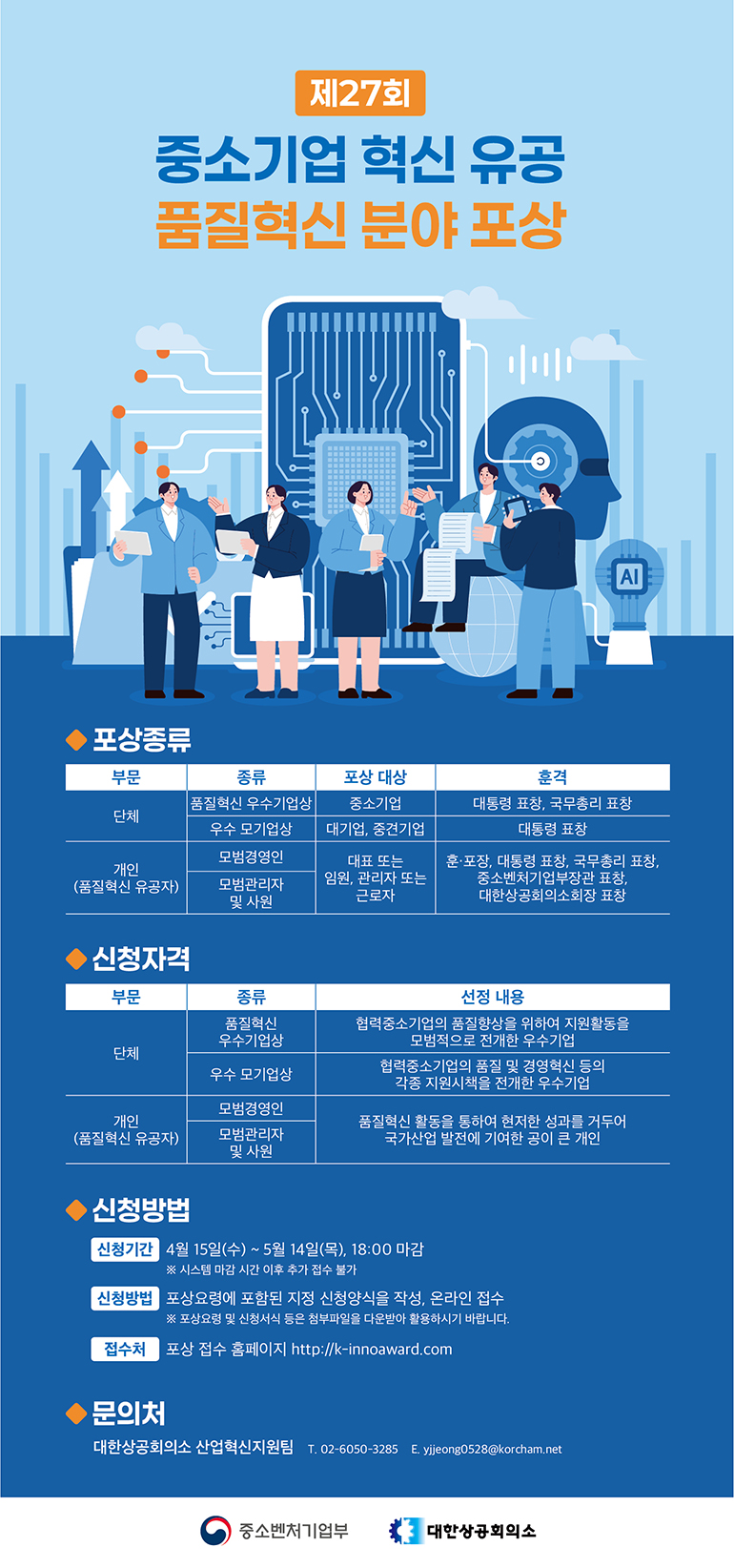 ![]() - 신청 접수 기한 : 2026. 5. 14(목) 18:00 - 신청 접수 방법 : https://k-innoaward.com/ 링크 접속 > '품질혁신 분야 포상신청' 선택 > 기업/유공자 분야 선택 > 신청서 작성 및 필요 파일 업로드 > 하단 '최종 신청'